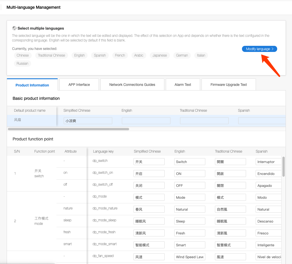 In the Product Development - Step 4: Cloud Configuration -> Multilingual section, you can set the App UI texts for the product in multiple languages based on the language of the target sales area of the product, including the multilingual texts for the Product Information, App Interface, Network Connections Guide, Alarm Text, Firmware Upgrade Text and other function points.