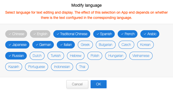 Click “Modify Language” to select the language for text editing and display. The effect of the selection on App depends on whether there are texts configured in the corresponding language. English will be selected by default if this field is blank.