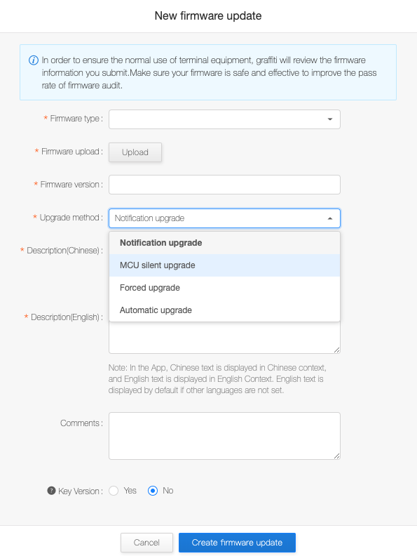 Click All Publish or Grayscale Publish. The system automatically submits a release application. Tuya will review your release application and the firmware security. Upon approval, Tuya will push the firmware to target consumers within the release scope that you specify.