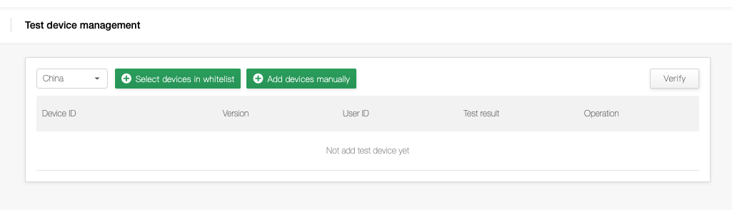 To test devices, configure a test whitelist first. You can add devices under your App account to the whitelist in batch.