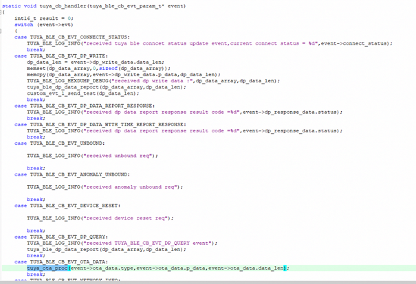 The Application receives OTA data through the registered callback function (without RTOS environment) or registered queue (in the RTOS environment), the EVENT ID is TUYA_BLE_CB_EVT_OTA_DATA. And the OTA response data is sent through tuya_ble_ota_response(tuya_ble_ota_response_t *p_data) function.