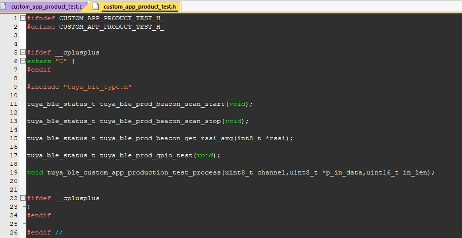 The tuya ble sdk has achieved the protocol of general authorization testing, however, testing such as RSSI testing, GPIO testing and additional testing for tailored products provided by general device testing must be implemented according to the product configuration. The source file tuya_ble_app_production_test.c in the tuya ble sdk has prepared APIs for the preceding testings, and they are defined in the form of __TUYA_BLE_WEAK weak implement. Your Application can redefine those APIs in other source files, for example, creating a custom_app_product_test.c file, and referring to it in your custom configuration file. As the following pictures show.