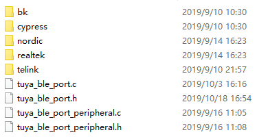 tuya_ble_port.hfile according to your configurations. Not all of the listed interfaces need to be implemented, for example, this porting tutorial does not involve OS, therefore, the OS-specific APIs are not needed. This tutorial is configured to use the internal memory management module of tuya ble sdk, therefore the memory allocation and release APIs are not needed. Under the port file of the tuya ble sdk, every platform is provided with porting reference file with the platform as the file name.After the port file is completed, define the port file in the