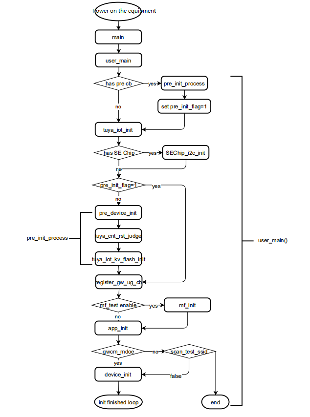 pre_init_process: makes preparation before initializing the Tuya IoT SDK. It is optional, therefore you can implement it depending on your needs. Thepre_init_processis vastly used for lighting products, it is recommended to turn on them as soon as possible to create a better user experience. During thepre_init_processstage, the following actions will be performed.pre_device_init: prints the status information and sets the importance level of logs.tuya_cnt_rst_judge: counts the hardware devices.tuya_iot_kv_flash_init: initializes the storage space to store the generated critical data during thepre_init_processoperation.Your customized actions, such as subscribing to events.