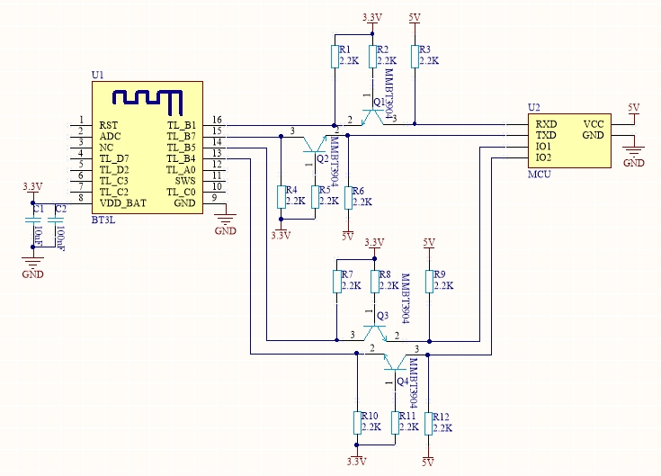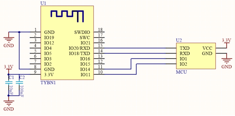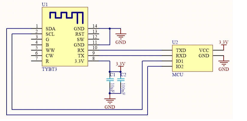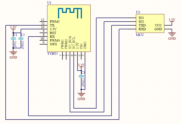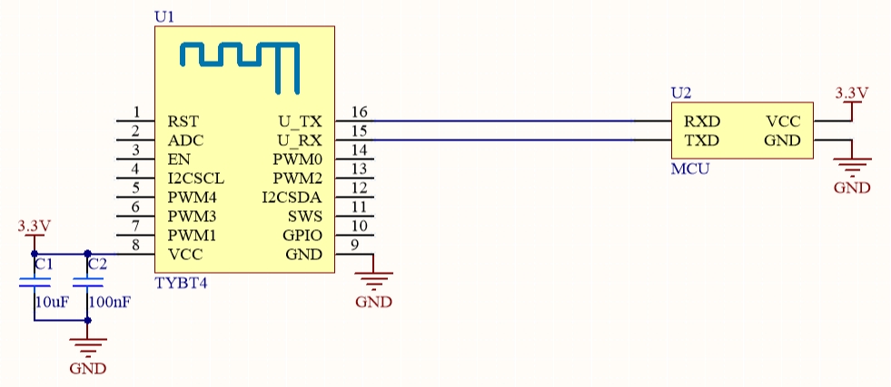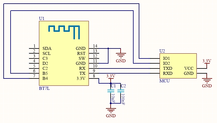 1.The power supply consumption: 3.3V,proposed supply current≥100mA. 2. Power filter capacitor C1 & C2 should be distributed as close to the 3.3V pin as possible.C1 & C2≥10uF. 3. RST pin is module hardware reset pin, effective under the low level. Without external circuitry, it can be directly connected to the IO port of MCU for use. 4. The TL_B5 pin is the low power control pin, the MCU sends and the module receives. 5. The TL_B4 pin is the connection status indicator pin, the module sends and the MCU receives.