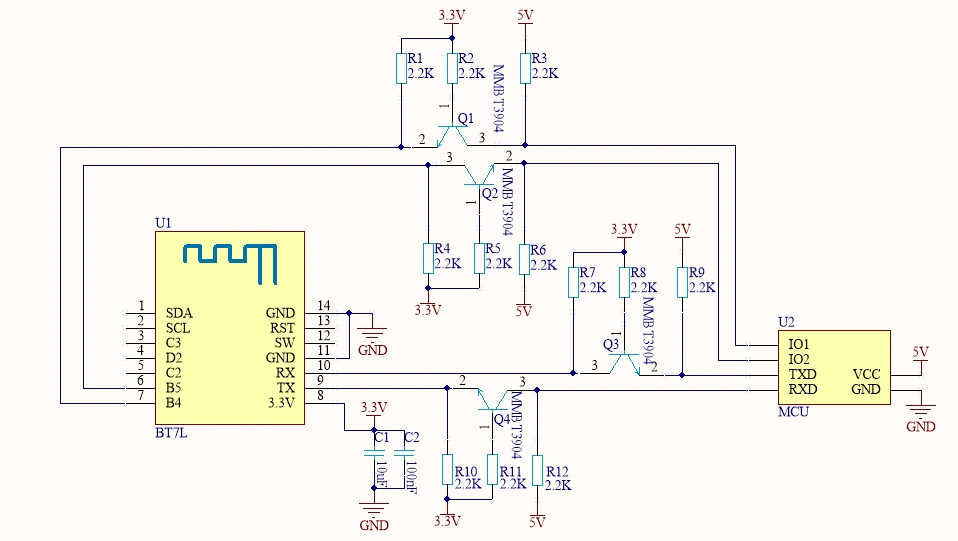 1.The power supply consumption: 3.3V,proposed supply current≥100mA. 2. Power filter capacitor C1 & C2 should be distributed as close to the 3.3V pin as possible.C1 & C2≥10uF. 3. RST pin is module hardware reset pin, effective under the low level. Without external circuitry, it can be directly connected to the IO port of MCU for use. 4. The B5 pin is the low power control pin, the MCU sends and the module receives. 5. The B4 pin is the connection status indicator pin, the module sends and the MCU receives.
