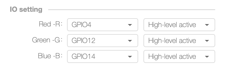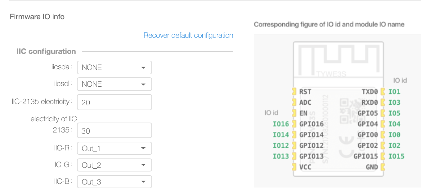 d) Color Drive Pin Connection Method: The options are Normal PWM Output, CW-PWM+RGB-I2C(16726), and CW- I2C(sm2135)+RGB-I2C(sm2135). Normal PWM Output indicates that three I/O interfaces generate PWM signals to control the red, green, and blue light. CW-PWM+RGB-I2C(16726) indicates that the IIC communication method controls the red, green, and blue light between the module and the SM726EB linear IC. CW- I2C(sm2135)+RGB-I2C(sm2135) indicates that the IIC communication method controls the red, green, and blue light between the module and the SM2135 linear IC. Note: If you select an incorrect method, the lamp cannot be controlled.