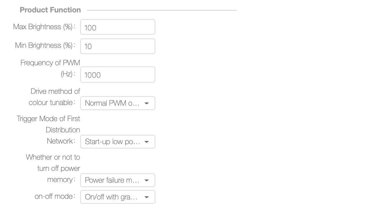c) Brightness After Network Configuration (%) and Color Temperature After Network Configuration: indicate the white light brightness and color temperature after network configuration. The values are the duty cycles of the PWM signals for controlling the white light brightness and color temperature. Note: The brightness value must be greater than the minimum dimming depth of the dimmable IC, or the lamp will turn off after network configuration. Consumers may think that the lamp is faulty.