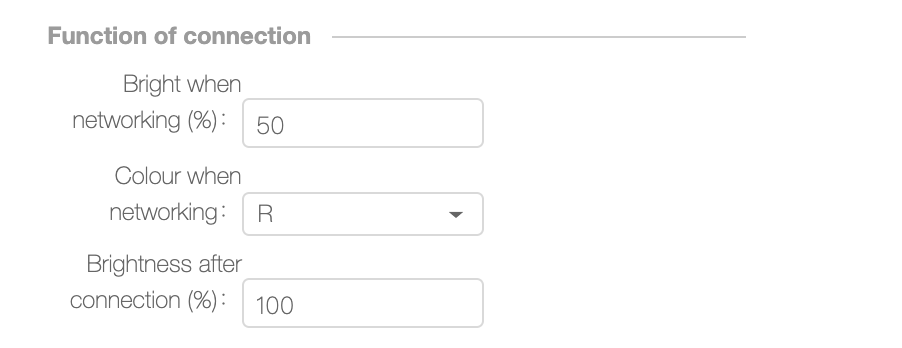 b) Color upon Network Configuration: indicates the light blinks in network configuration mode. The options are R, G, B, C, and W.