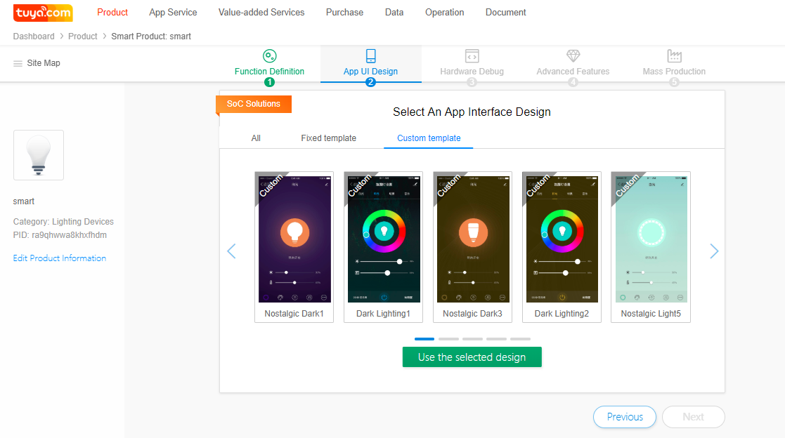 (Recommended) On the displayed Create new product page, choose Smart Lighting and select a product under Plug and Play Solution. Alternatively, select a product under Custom if the development-free solution cannot meet your product function requirements.