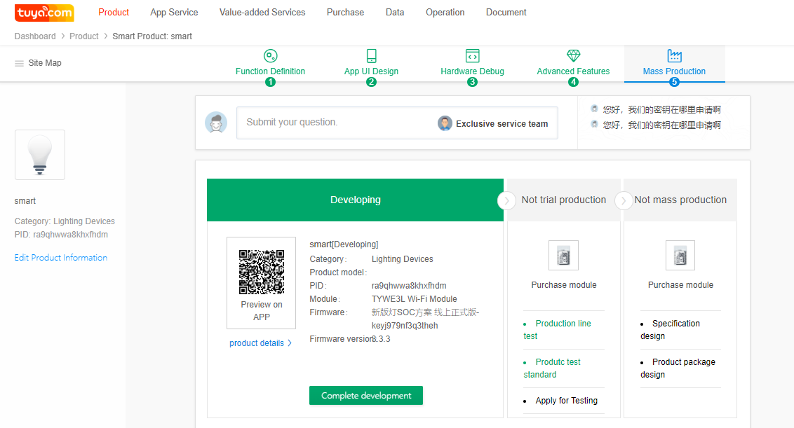 After the sample product passes the test, click Complete development to enter the trial production phase.