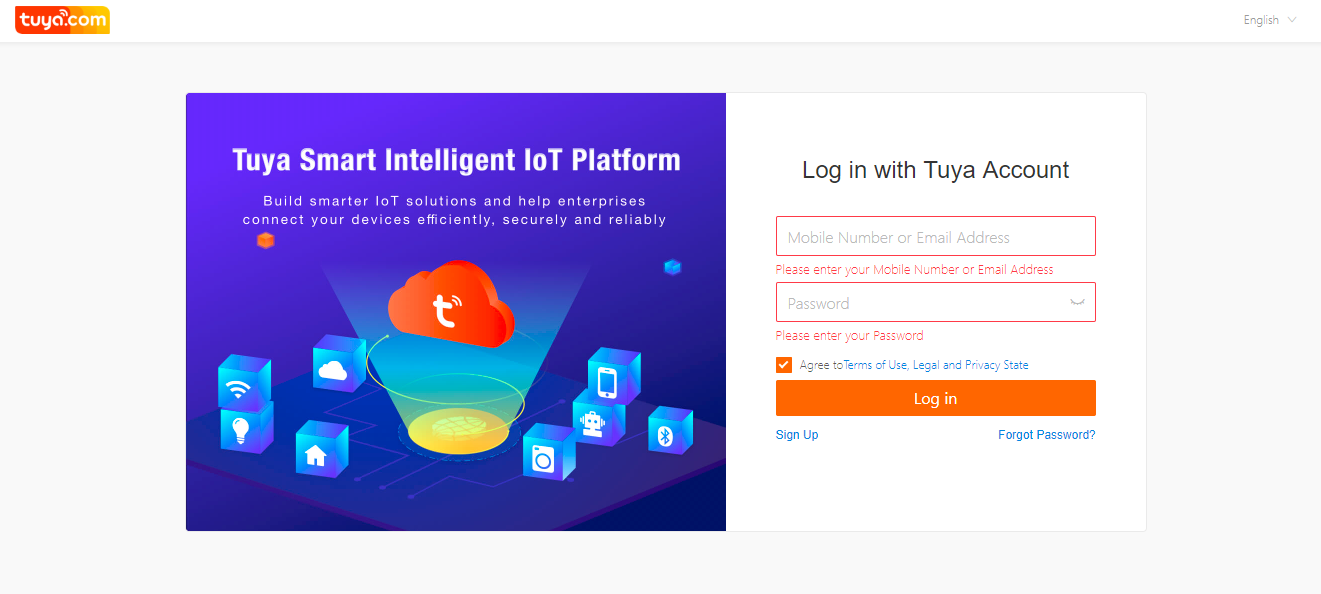Register with and log in to the Tuya Smart platform at https://iot.tuya.com.