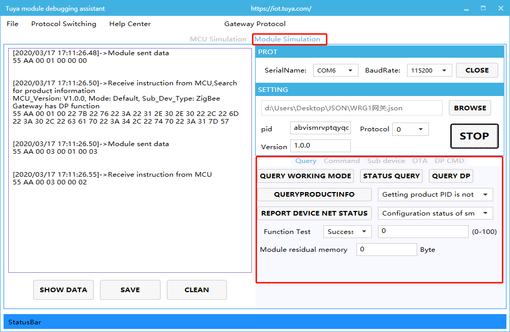 Note: Tuya module debugging assistant module simulation mode, without networking function, only used to verify the correctness of MCU serial protocol transmission and reception. After the test is completed, the MCU can be connected to the actual module and network.