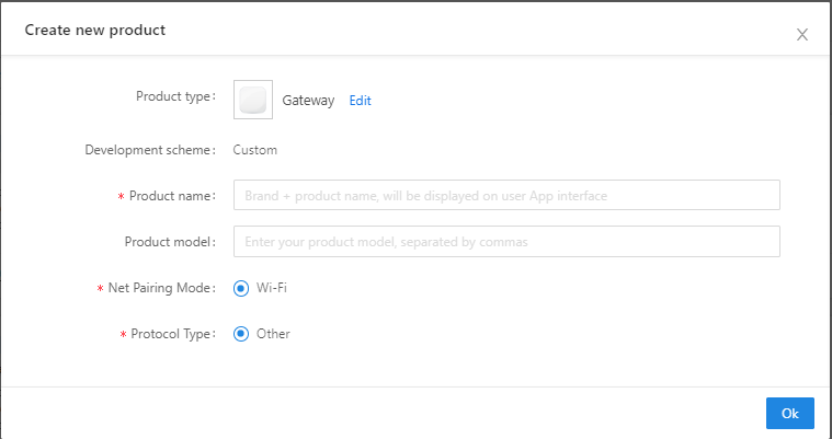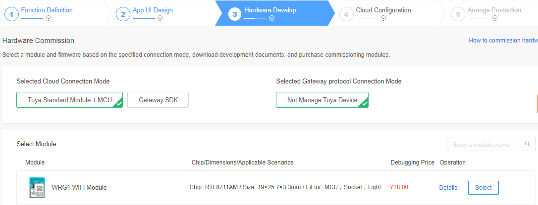 When creating a product selection module, the platform will recommend some common module models. At present, the gateway MCU access solution can only be provided by Wi-Fi gateway module-WRG1.