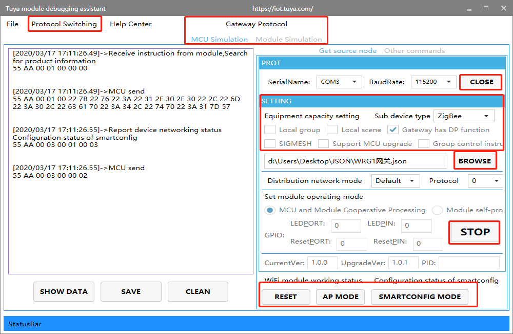 step2. Set device capabilities,open the Tuya module debugging assistant in the development kit and import the debugging file. Protocol selection Wi-Fi gateway protocol, MCU simulation mode.