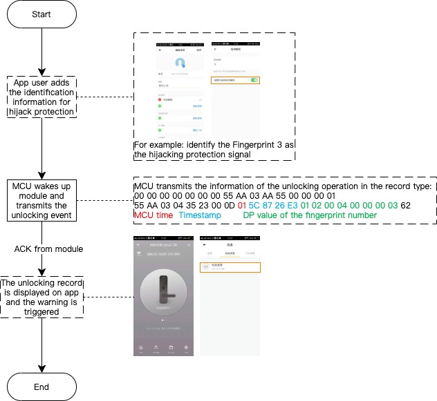 It can be used when the door is equipped with the hijack alarm capacity. A hijacking alarm is issued from the cloud rather than device. For example, if user sets the Fingerprint 3 as the hijacking alarm trigger, the alarm will be triggered when the server side received the unlocking event of Fingerprint 3.