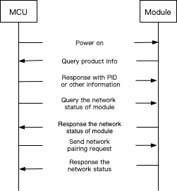 There is a GPIO port reserved between the Tuya Zigbee module and the MCU, use as the module to wake up the MCU. The default setting is the internal pull-up state, which is effective when pulled down to 10ms. The MCU wakes up the Zigbee module by waking up the serial command. If the device is a strong current device, the MCU only needs to make a handshake connection when the device is powered on for the first time. If the device is a weak current device with dormant, apart from making a handshake connection when power on, the MCU needs to connect to the handshake connection before each active command is initiated.