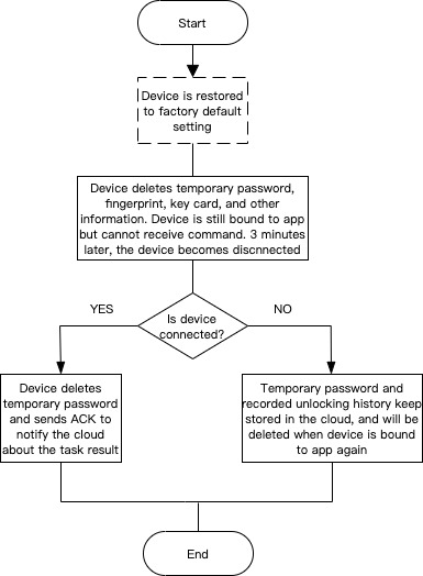 It is used to restore the smart lock to factory setting and clear all temporary passwords. When the door lock is restored to the factory settings, the cloud makes a request to the smart lock to clear the local temporary password, after the restoration is completed, the cloud receives the temporary password status that are transmitted by the module. In case of network failure, the module transmits the result again when it is connected the next time.