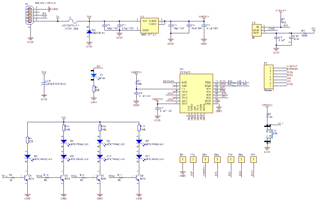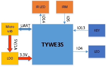TYSW_012 is an infrared (IR) universal remote control that Hangzhou Tuya Inc. has developed. It consists of a low-power TYWE3S Wi-Fi module, an IR emitter, and an integrated IR receiver. Figure 1 shows the TYSW_012 architecture.
