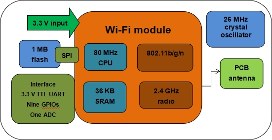 The TYWE3S module consists of a highly integrated RF chip (ESP8266) and several peripheral components, with a built-in Wi-Fi network protocol stack and robust library functions. It is embedded with a low-power 32-bit CPU, 1 MB flash memory, and 50 KB SRAM, and has extensive peripherals. TYWE3S is an RTOS platform that integrates all the function libraries of the Wi-Fi MAC and TCP/IP protocols. Figure 2 shows the TYWE3S architecture.