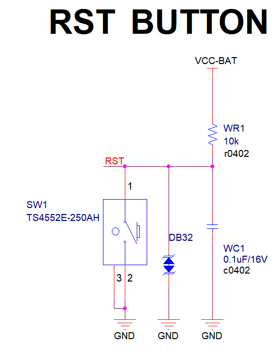 VWXR2 reset circuit can refer to the following figure, RST recommended to pull up to VCC_BAT (usually 5V), low level reset, it is recommended to reserve ESD, please refer to vwxr2_design_referring.pdf for details.
