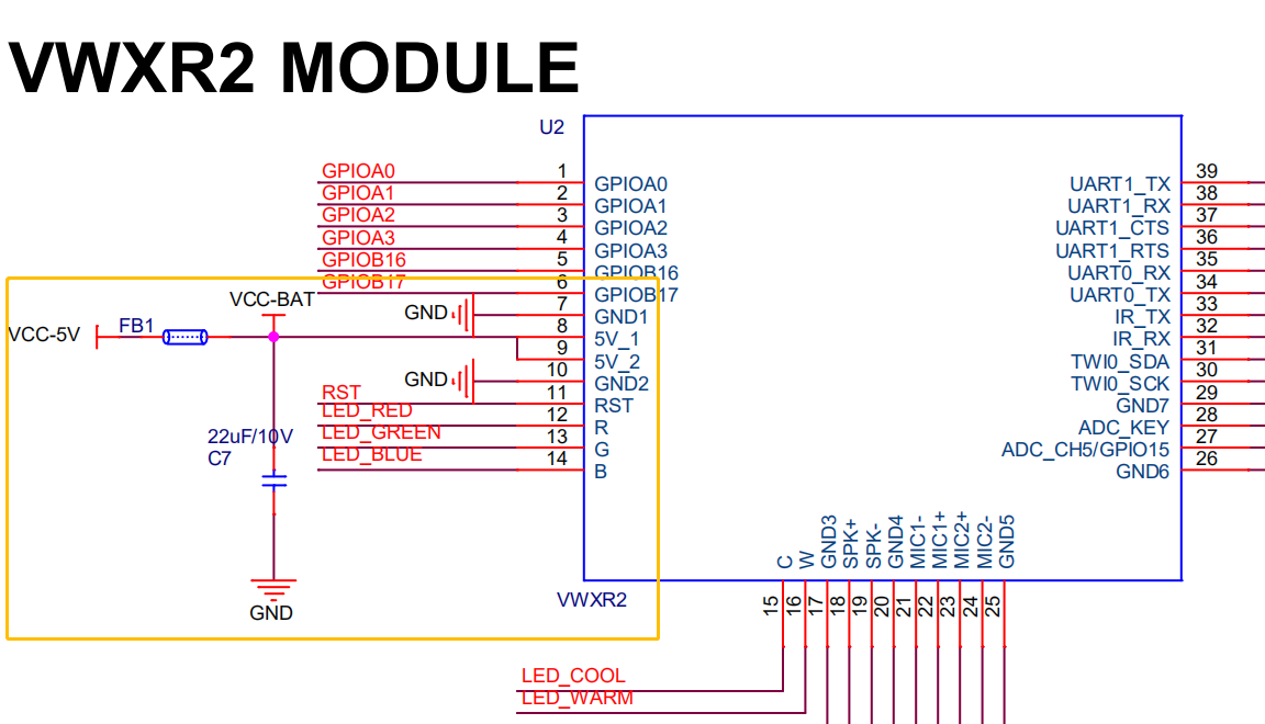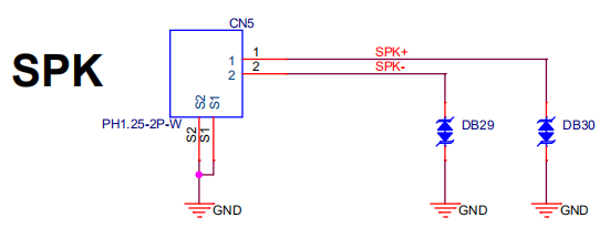 The VWXR2 module integrates the class D power amplifier, which can generate 2W power with a 4-ohm horn under the condition of 5V power supply. The SPK design circuit is shown in the following figure.
