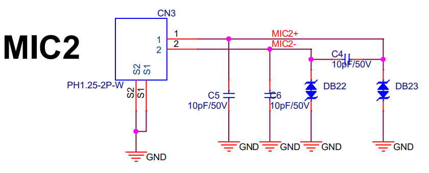 For the MIC circuit, in order to simplify the peripheral circuit, the peripheral circuit only needs to be designed as shown in the following figure, with ESD protection circuit and TDD inhibition circuit reserved.