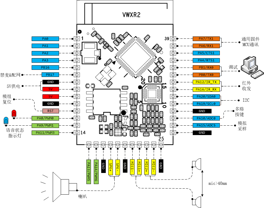 2) the network indicator light and the voice-related indicator light default PWM0 and PWM1, other applications can consider using PWM3/PWM5/PWM6 to do LED display light effect expansion (PWM will be better support for breathing light, if no breathing effect, GPIOA0/1/2/3/16 can also be used).