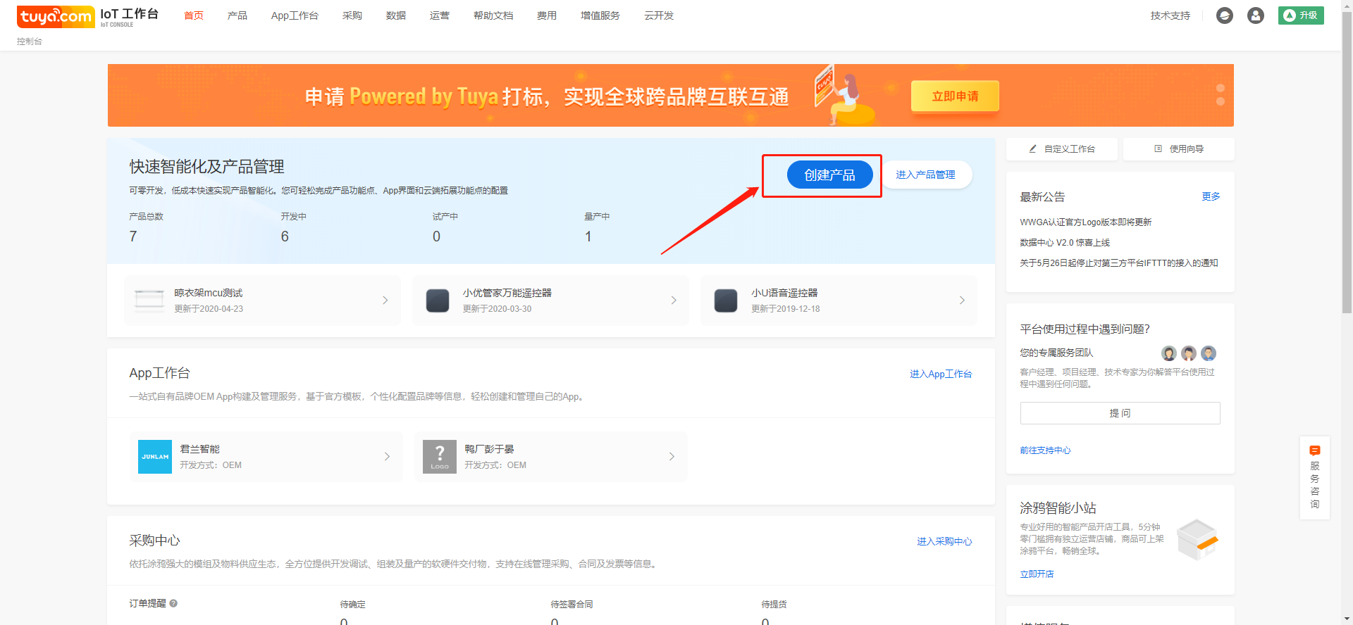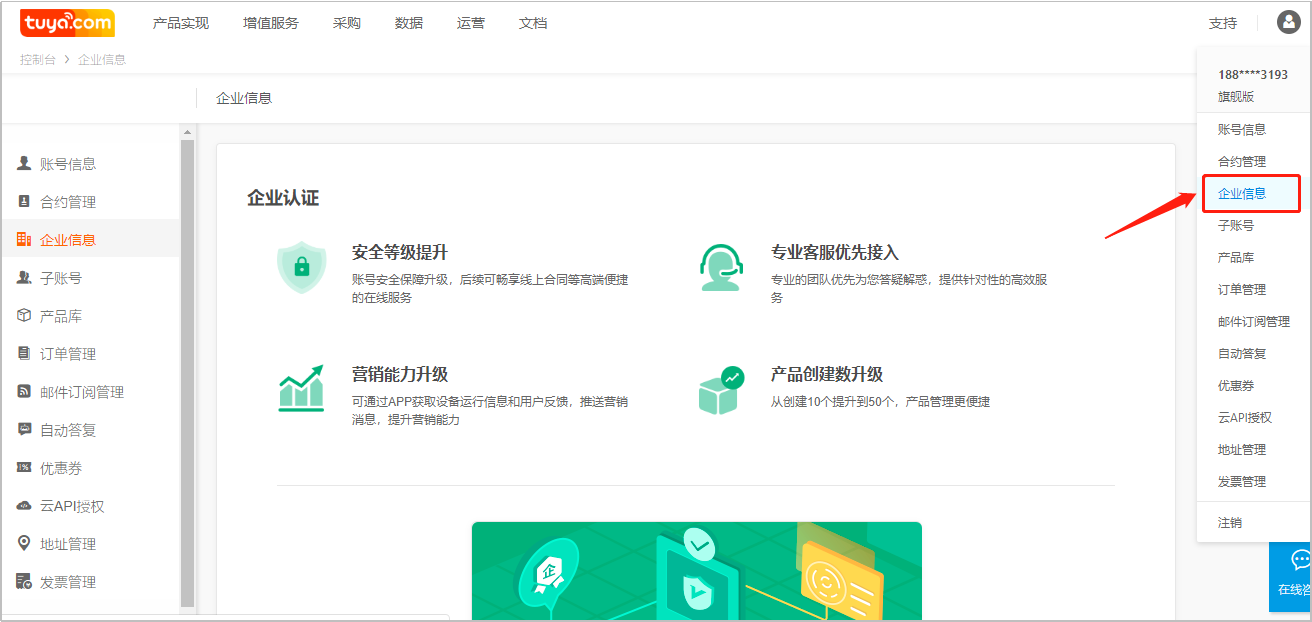Register and log in the Tuya IoT platform (iot.tuya.com). 2. It is suggested to complete the enterprise certification at the same time.