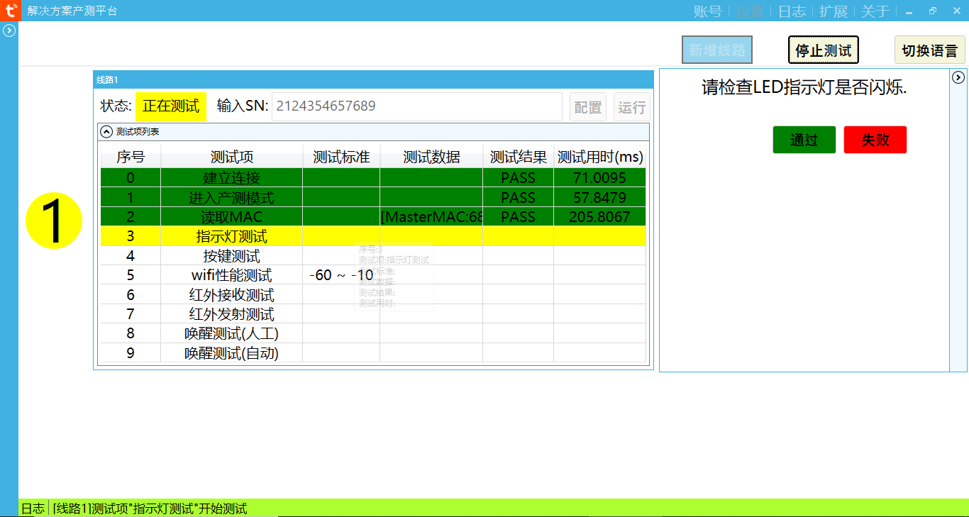 Wifi performance test: the router with SSID of tuya_mdev_test1 needs to be set and placed 3-5 meters away from the product under test. When the module receives the router's signal strength at -60db-10db, it is qualified. Test pass to automatically modulate the next step, and test fail to stop the test.